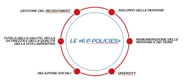 È fondamentale pertanto costruire un rapporto, con i propri dipendenti e collaboratori, che si basa su principi di lealtà, fiducia e rispetto reciproco. Michelin Italiana adotta le “6 P Policies”, politiche che esprimono l’impegno dell’Azienda in relazione alle aree indicate nel grafico in basso: