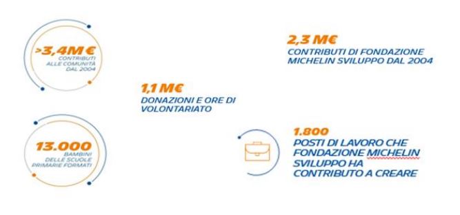 Con il contributo dei suoi dipendenti e della Fondazione Michelin Sviluppo, Michelin Italiana si impegna a raggiungere tre obiettivi: promuovere lo sviluppo dell’economia locale, promulgare i valori di rispetto propri della cultura aziendale nelle comunità in prossimità delle quali opera e promuovere iniziative sulla sicurezza stradale.