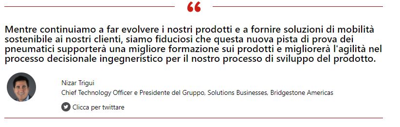 “Siamo entusiasti di far progredire il nostro centro di ricerca e sviluppo di tecnologie all’avanguardia con l’espansione della capacità di test ad Akron”, ha dichiarato Nizar Trigui, Chief Technology Officer e Presidente solutions businesses di Bridgestone Americas. “Mentre continuiamo a migliorare i nostri prodotti e a fornire soluzioni di mobilità sostenibile ai nostri clienti, siamo fiduciosi che questa nuova pista di prova supporterà una migliore formazione sui pneumatici e migliorerà l’agilità nel processo decisionale ingegneristico per il nostro processo di sviluppo del prodotto”.