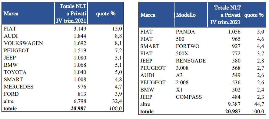 La Fiat è la marca più noleggiata dai privati, seguita nell’ordine da Audi, Volkswagen e Peugeot.