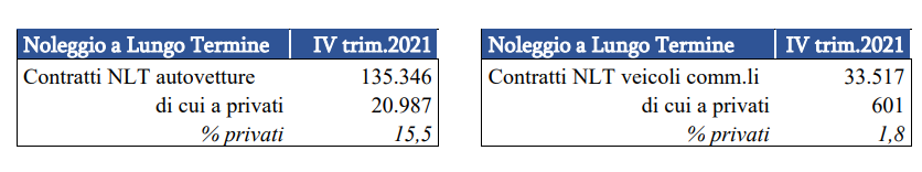 In particolare, nell’ultimo trimestre del 2021 dei 135.346 contratti di noleggio a lungo termine di autovetture, il 15,5% (circa 21.000 unità) è stato destinato ad un utilizzatore privato. Sommando all’acquisto diretto il noleggio a lungo termine, la quota di mercato degli utilizzatori privati sul mercato del nuovo passa dal 63,2% al 70,2% nell’ultimo trimestre dell’anno.