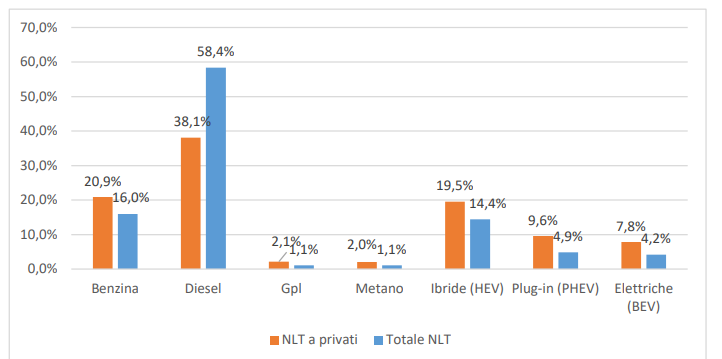 Il diesel è la motorizzazione più richiesta, ma plug-in ed elettriche coprono rispettivamente il 9,6% e il 7,8% delle preferenze delle autovetture noleggiate a privati, segno che la modalità del noleggio a lungo si presta bene alle nuove motorizzazioni soggette a rapida evoluzione.