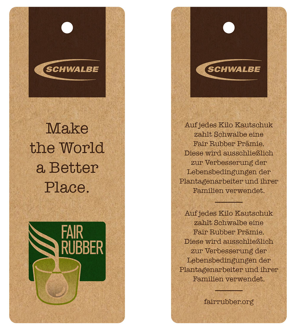 Il pneumatico Schwalbe Pick-Up, per cargo-bike e il Marathon E-Plus, specialista per le e-bike, sono i primi pneumatici per bicicletta prodotti con caucciù proveniente dal commercio equo-solidale. Schwalbe ha aderito alla Fair Rubber e. V., associazione che sostiene i raccoglitori di gomma naturale all’inizio della filiera. Sebbene il 70 percento del caucciù naturale trattato in tutto il mondo viene impiegato nell’industria dei pneumatici, Schwalbe finora è il primo produttore del settore ad essersi associato alla Fair Rubber e.V.