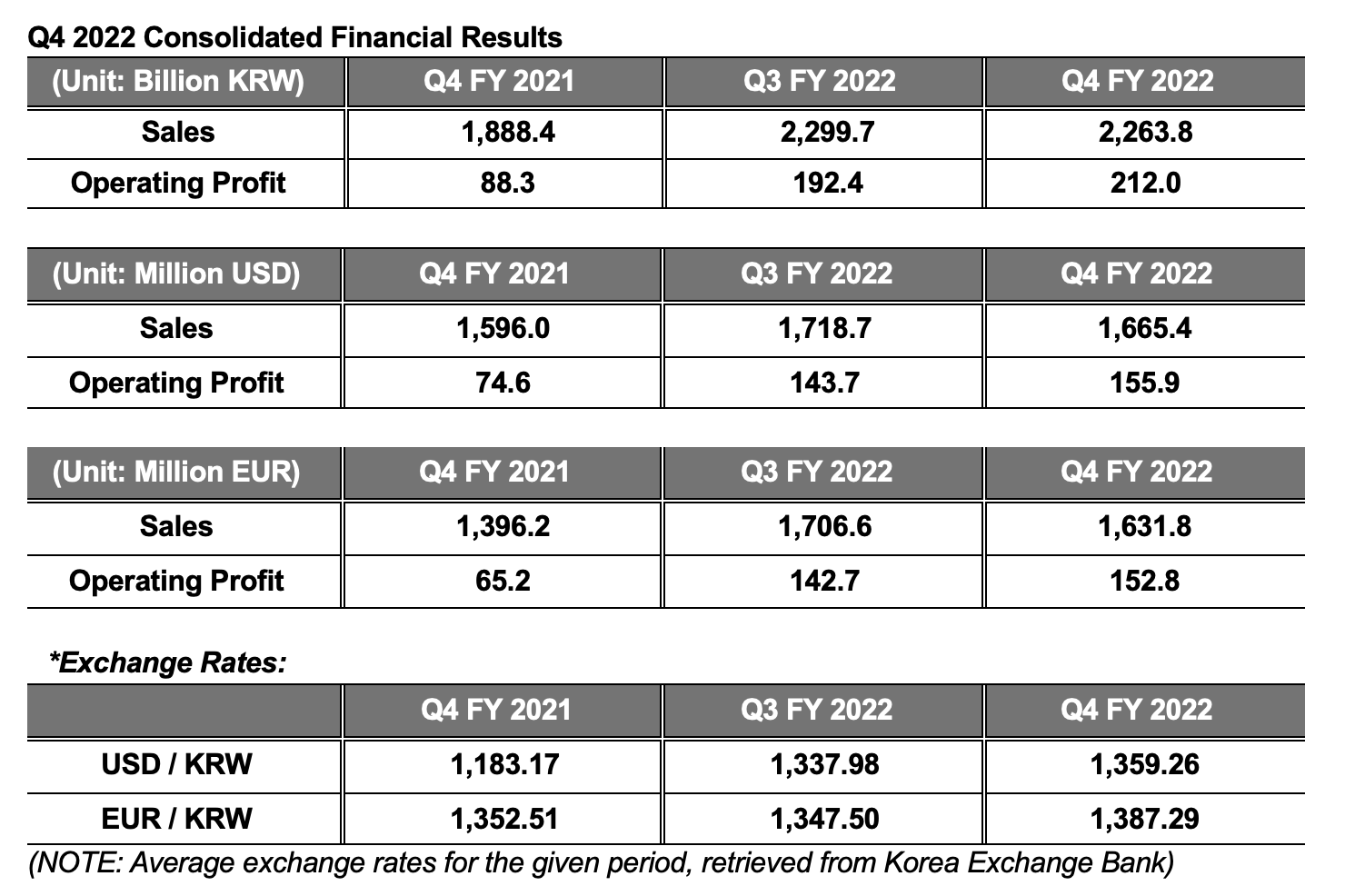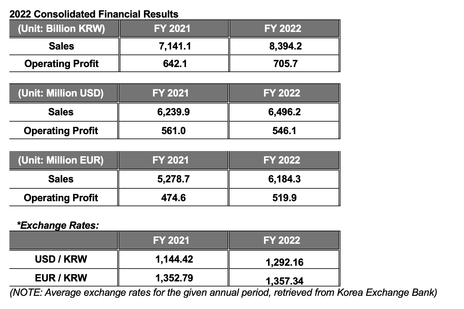 Hankook ha annunciato i risultati finanziari per il 2022 con vendite globali consolidate al massimo storico di 8.394,2 miliardi di KRW (circa 6.184,3 milioni di euro). L’utile operativo si è attestato a 705,7 miliardi di KRW (circa 519,9 milioni di euro). Le vendite e l’utile operativo sono aumentati su base annua rispettivamente del 17,5% e del 9,9%.
