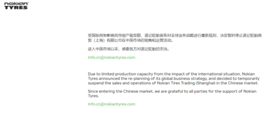 Il sito web ufficiale cinese di Nokian Tyres afferma che il produttore di pneumatici finlandese si sta ritirando dal mercato a causa della sua “capacità produttiva limitata”.