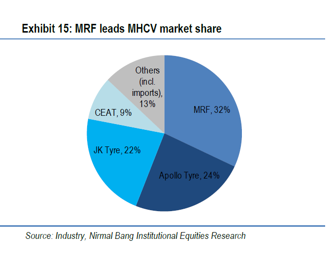 Secondo gli analisti di Nirmal Bang, la crescita del volume di MRF negli ultimi cinque anni è stata la più lenta, con un CAGR del 5%. Le cifre di Apollo e Ceat sono il doppio.