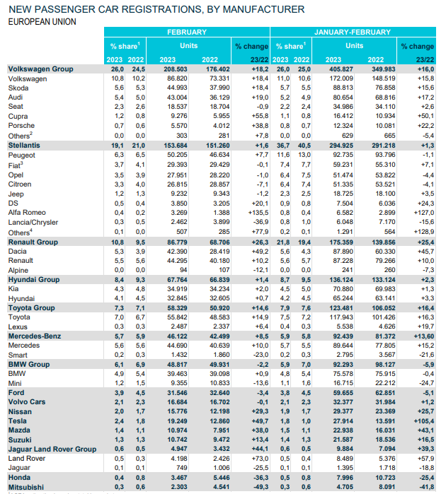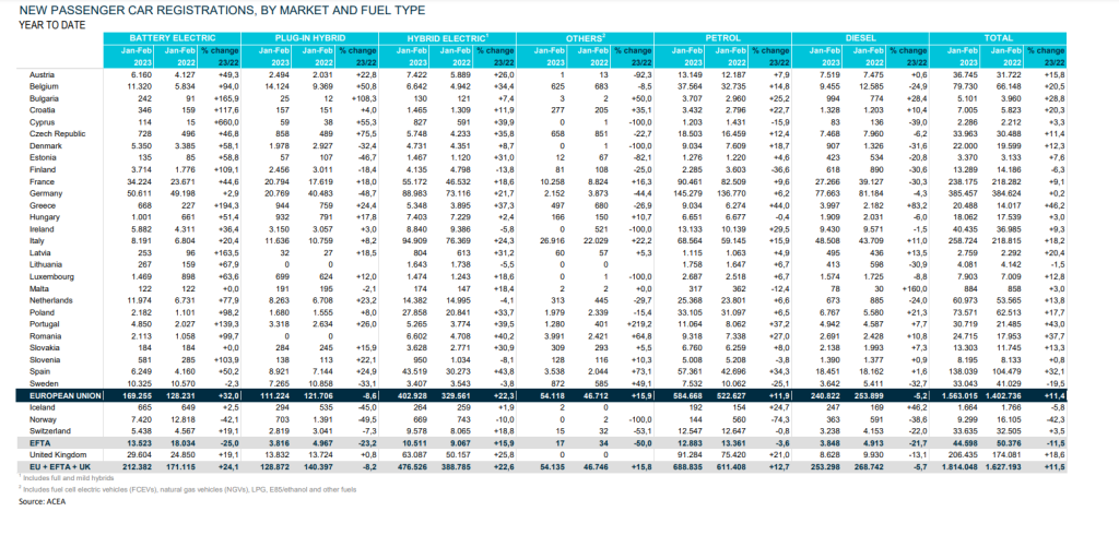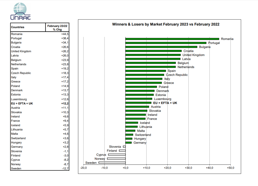 Settimo mese consecutivo di crescita per il mercato dell’auto in Europa, che a febbraio mostra 902.775 immatricolazioni e un aumento del 12,2% rispetto alle 804.414 unità di febbraio 2022. Positivo quindi il primo bimestre dell’anno con 1.814.048 immatricolazioni, in rialzo a +11,5% rispetto a 1.627.193 di gennaio-febbraio 2022.