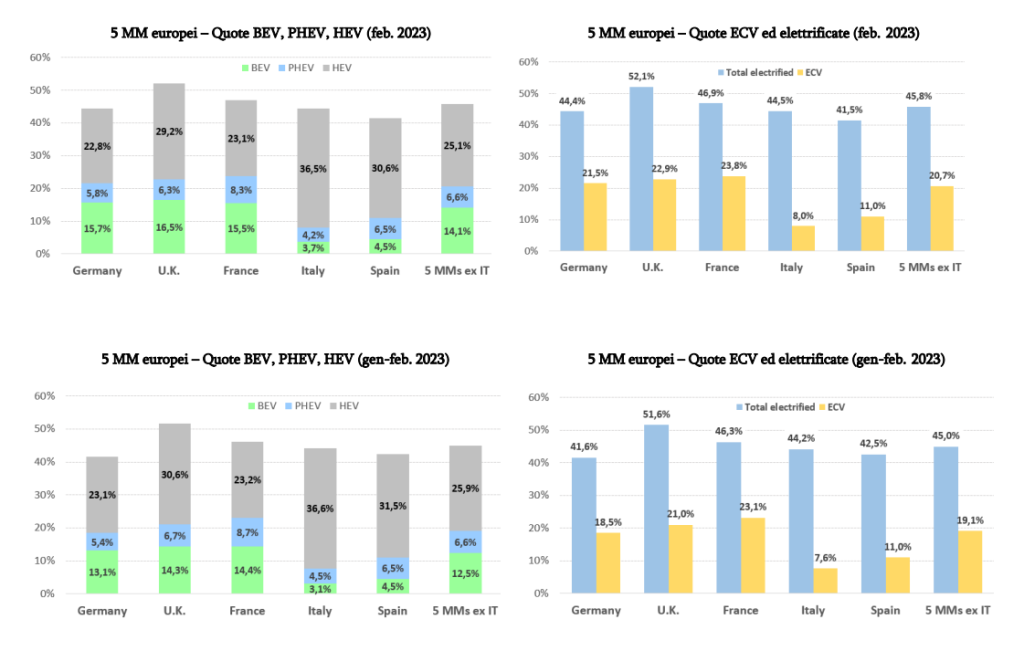 Nel mese di febbraio recuperano tutti i 5 Major Markets, ma con andamento differenziato: il Regno Unito cresce del 26,2%, la Spagna del 19,2%, l’Italia del 17,4%, la Francia del 9,4% e chiude la Germania con un timido +2,8% per il forte calo delle ibride plug-in (PHEV) che a partire dal 2023 non fruiscono più degli incentivi. Nel bimestre il primato è della Spagna con +32,1%, seguita da Regno Unito con +18,6%, Italia a +18,2%, Francia +9,1% e infine Germania stabile a +0,2%.