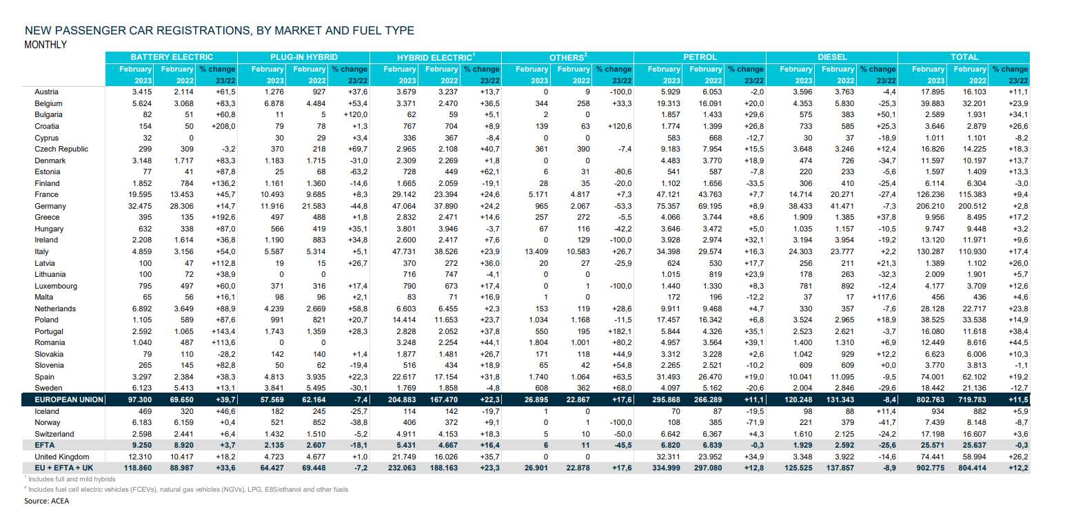 Settimo mese consecutivo di crescita per il mercato dell’auto in Europa, che a febbraio mostra 902.775 immatricolazioni e un aumento del 12,2% rispetto alle 804.414 unità di febbraio 2022. Positivo quindi il primo bimestre dell’anno con 1.814.048 immatricolazioni, in rialzo a +11,5% rispetto a 1.627.193 di gennaio-febbraio 2022.