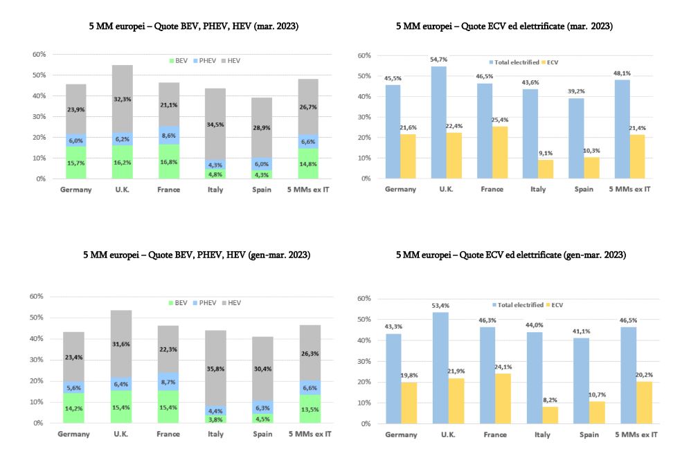 in del trimestre, con le BEV a quota 3,8% e le PHEV a 4,4%. Al primo posto c’è invece la Francia (BEV 15,4%, PHEV 8,7%), poi il Regno Unito (BEV 15,4%, PHEV 6,4%), la Germania (BEV 14,2%, PHEV 5,6%) e la Spagna (BEV 4,5% e PHEV 6,3%).