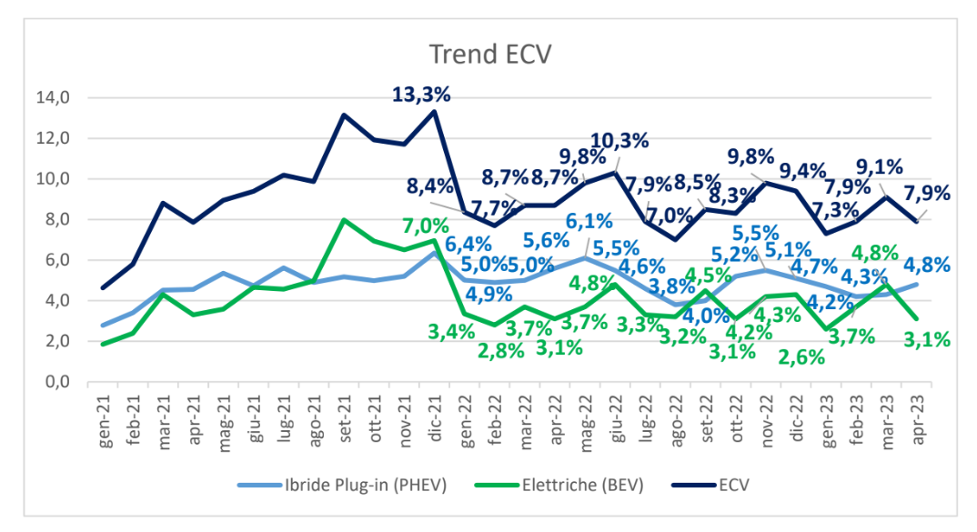 Tra le alimentazioni, il motore a benzina segna un forte recupero, salendo al 29,2% di quota (+2,2 p.p., al 27,6% in gennaio-aprile), il diesel retrocede al 19,7% di quota (-1,4 p.p., al 19,6% nel 1° quadrimestre). Il Gpl risale all’8,3% di share in aprile (al 9,0% nel primo quadrimestre) e il metano, unica motorizzazione in flessione, si ferma allo 0,1% di quota, come nel cumulato. Le auto BEV scendono nuovamente in quota rispetto al recupero di marzo, fermandosi al 3,1% di share nel mese (3,7% nel quadrimestre), mentre le PHEV si portano al 4,8% (4,5% in gennaio-aprile). Nel complesso le auto ECV rappresentano in aprile il 7,9% del mercato. Le vetture ibride rimangono sostanzialmente stabili al 34,8% delle preferenze (35,5% in gennaio- aprile), con un 8,3% per le “full” hybrid e 26,5% per le “mild” hybrid.