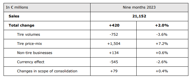 L’effetto prezzo positivo dovuto agli aumenti dei prezzi introdotti nel 2022 e all’inizio del 2023 per compensare tutti i fattori di inflazione dei costi (materie prime, noli, energia, buste paga) è stato pari a 1,285 miliardi di euro, mentre l’effetto mix positivo di 219 milioni di euro riflette (i) l’attenzione prioritaria al marchio Michelin in ogni segmento e (ii) la crescita in domanda di pneumatici dai 18 pollici in su nel segmento dei pneumatici per autovetture e autocarri leggeri, dove il gruppo sta guadagnando quote di mercato. Favorevole anche il mix geografico, con un andamento più vivace domanda nel Nord America.