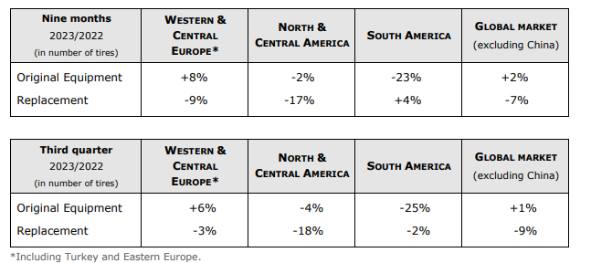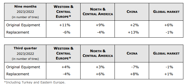 Il mercato globale del sell-in di pneumatici di primo equipaggiamento e sostitutivi per autovetture e autocarri leggeri è rimasto in linea con i livelli dell’anno scorso, sia nel terzo trimestre che nei primi nove mesi del 2023.