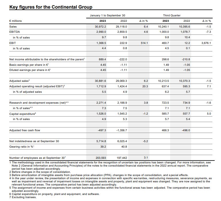 Nel terzo trimestre del 2023, Continental ha realizzato un fatturato consolidato di 10,2 miliardi di euro, in calo dell’1,5% rispetto al terzo trimestre 2022, quando aveva chiuso a 10,4 miliardi di euro. Il suo risultato operativo rettificato è stato di 637 milioni di euro (terzo trimestre 2022: 595 milioni di euro, +7,1%), corrispondente a un margine EBIT rettificato del 6,2% (terzo trimestre 2022: 5,7%).