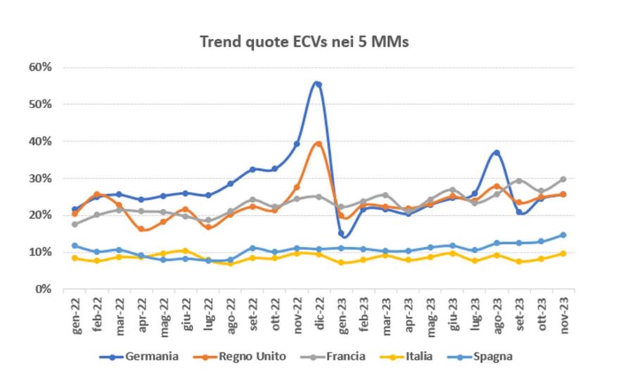 In novembre, con una quota in recupero al 9,7%, che comprende il 5,6% delle BEV e il 4,1% delle PHEV, resta ampio il divario con la Germania che ha le PHEV 7,4% e le BEV al 18,3%, in leggero recupero rispetto a ottobre ma in calo di 4 punti di quota vs novembre 2022 a causa dell’esclusione delle persone giuridiche dagli incentivi a partire dal 1° settembre, che ha segnato una massiccia anticipazione degli acquisti al mese di agosto. Divario elevato anche nei confronti della Francia (BEV 20,2% e PHEV 9,5%), del Regno Unito (BEV 15,6% e PHEV 10,1%), della Spagna (BEV 7,7% e PHEV 7,0%).