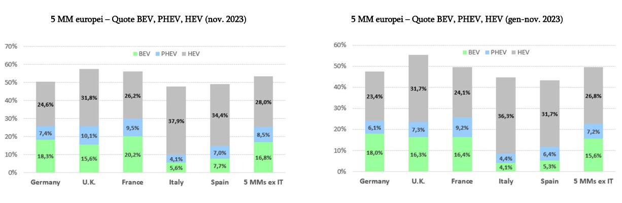 Anche negli 11 mesi l’Italia è all’ultimo posto, con le BEV a quota 4,1% e le PHEV al 4,4%, mentre la Germania mostra le BEV al 18,0% e le PHEV al 6,1%; la Francia BEV al 16,4% e PHEV al 9,2%; Regno Unito BEV al 16,3% e PHEV al 7,3%; Spagna BEV al 5,3% e PHEV al 6,4%.