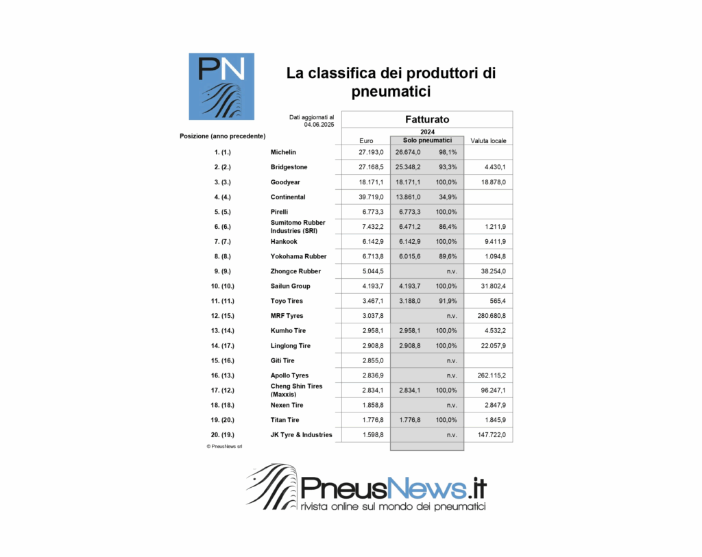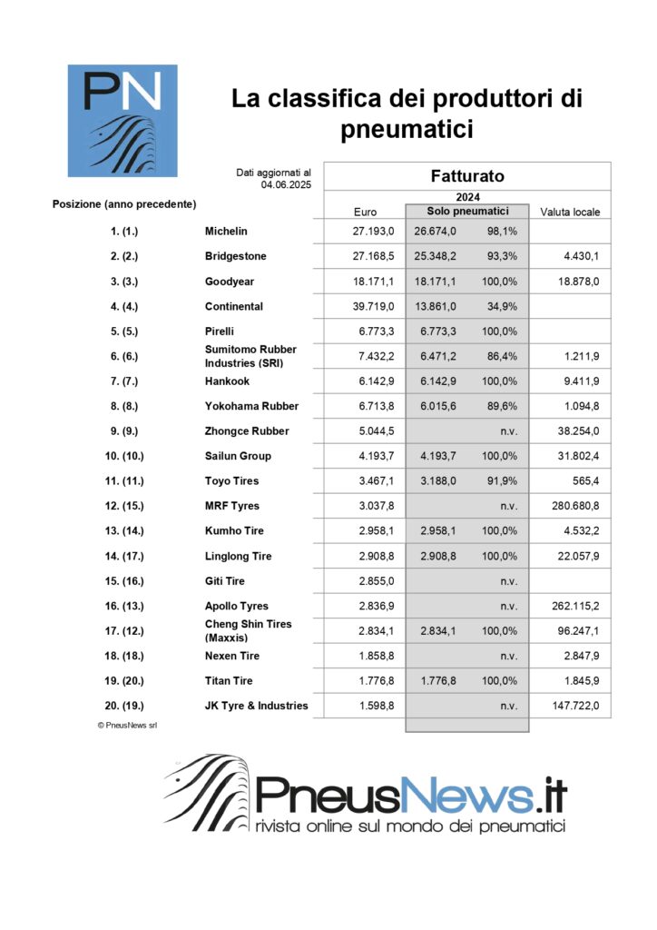 Non cambia nulla nella TOP 10 della classifica dei produttori di pneumatici, sulla base delle vendite del 2024, dimostrando una grande stabilità del settore. Tuttavia, se si vanno a vedere le posizioni dalla 11esima in giù, le novità ci sono, eccome.