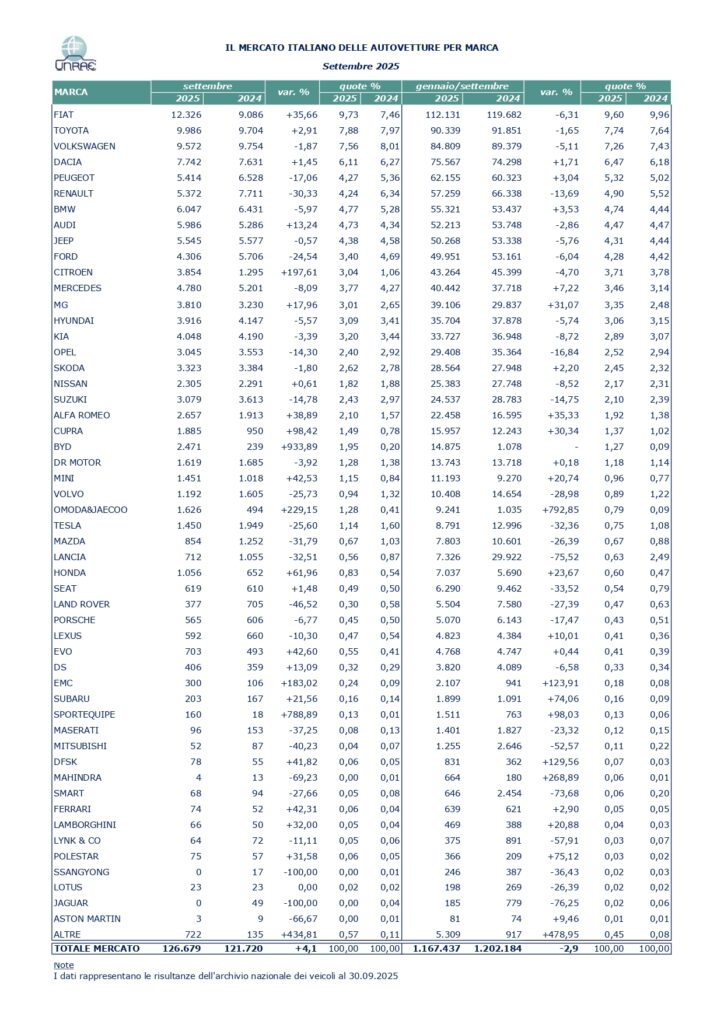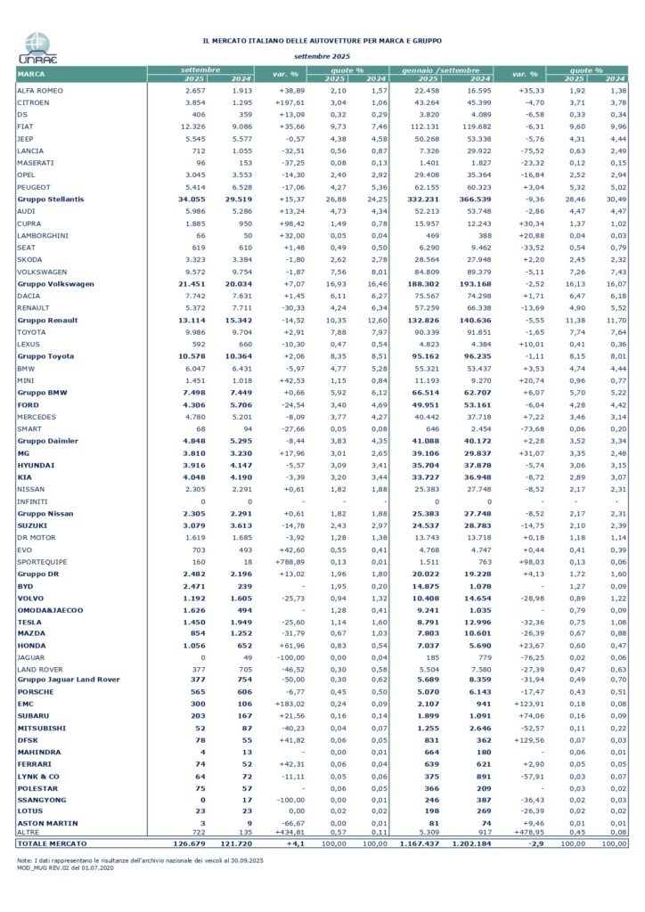 Mercato autovetture Italia: a Settembre 2025 +4,1%