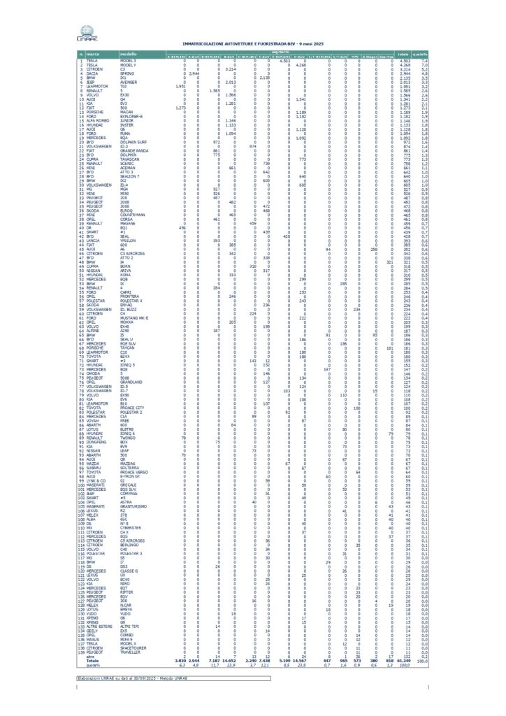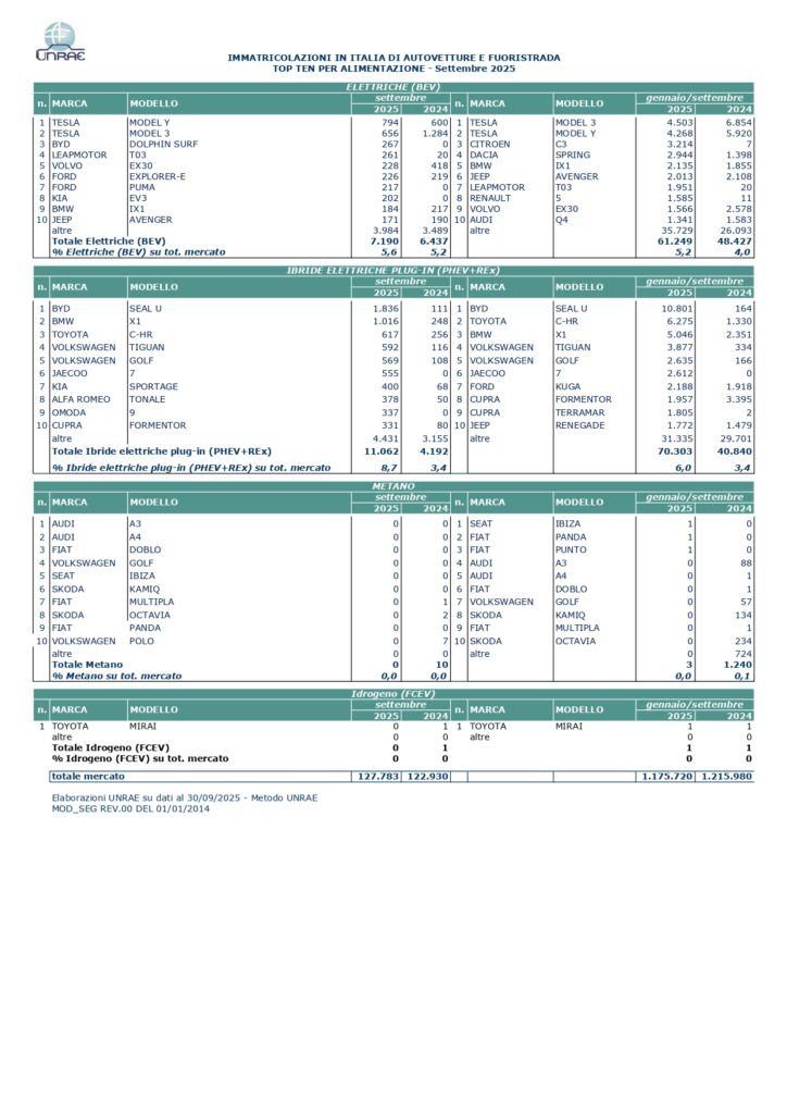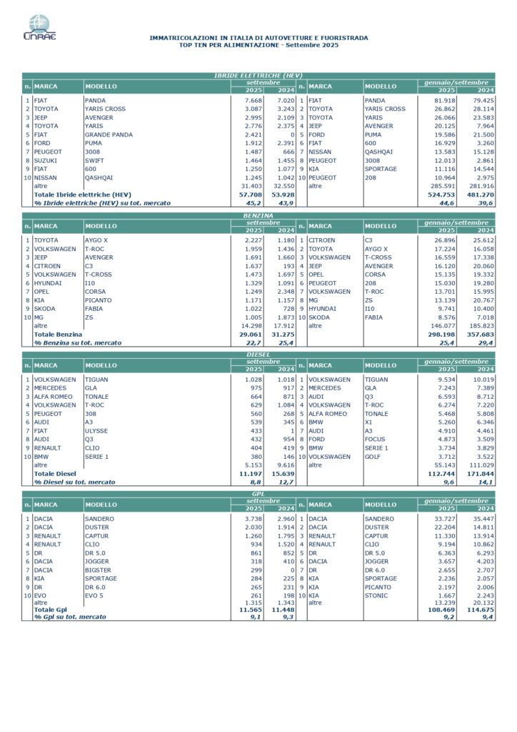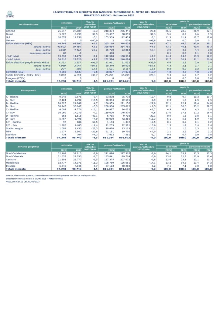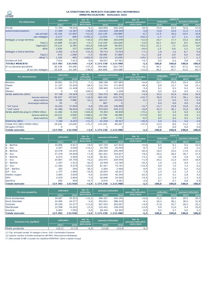 Tra le alimentazioni, a settembre il motore a benzina cede in volume e perde 2,7 punti, scendendo al 22,7% (25,4% nel cumulato, -4,0 p.p.). Il diesel scende all’8,8% di share (-3,9 p.p. e al 9,6% in gennaio-settembre, -4,5 p.p.); il Gpl, seppur in lieve crescita in volume, scende al 9,1% a settembre (-0,2 p.p.) e al 9,2% nel cumulato (-0,2 p.p.). Le vetture ibride nel mese raggiungono il 45,2% (+1,3 p.p.) e il 44,6% (+5,0 p.p.) nei 9 mesi, con un 12,7% per le “full” hybrid e 32,5% per le “mild” hybrid in settembre. Come anticipato, le auto BEV si portano al 5,6% del totale (+0,4 p.p. e al 5,2% in gennaio-settembre, +1,2 p.p.), mentre le PHEV salgono all’8,7% (+5,3 p.p. e al 6,0% nei 9 mesi, +2,7 p.p.).