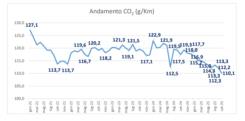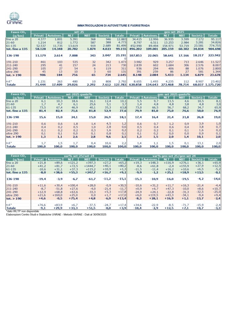 Le emissioni medie di CO2 delle nuove immatricolazioni in settembre flettono del 6,3% a 110,1 g/Km e del 4,7% nei 9 mesi a 113,8 g/Km. L’analisi delle immatricolazioni di settembre per fascia di CO2 riflette l’andamento nel mese di auto BEV e PHEV: la fascia 0-20 g/Km rappresenta il 10,1% del mercato, il 3,7% la fascia 21- 60 g/Km (rispettivamente 8,1% e 3,0% nel cumulato). La fascia 61-135 g/Km rappresenta il 63,8% (65,9% nel cumulato), mentre la quota delle vetture da 136 a 190 g/Km si porta al 18,1% e quella della fascia oltre i 190 g/Km al 2,1% (rispettivamente 19,0% e 2,0% nei 9 mesi).