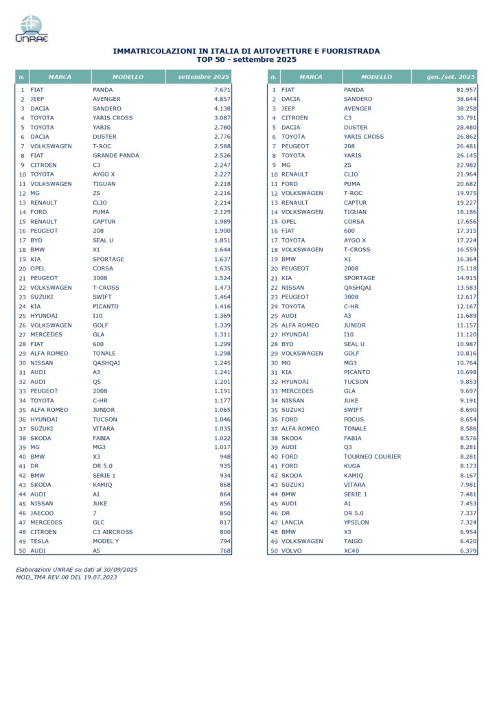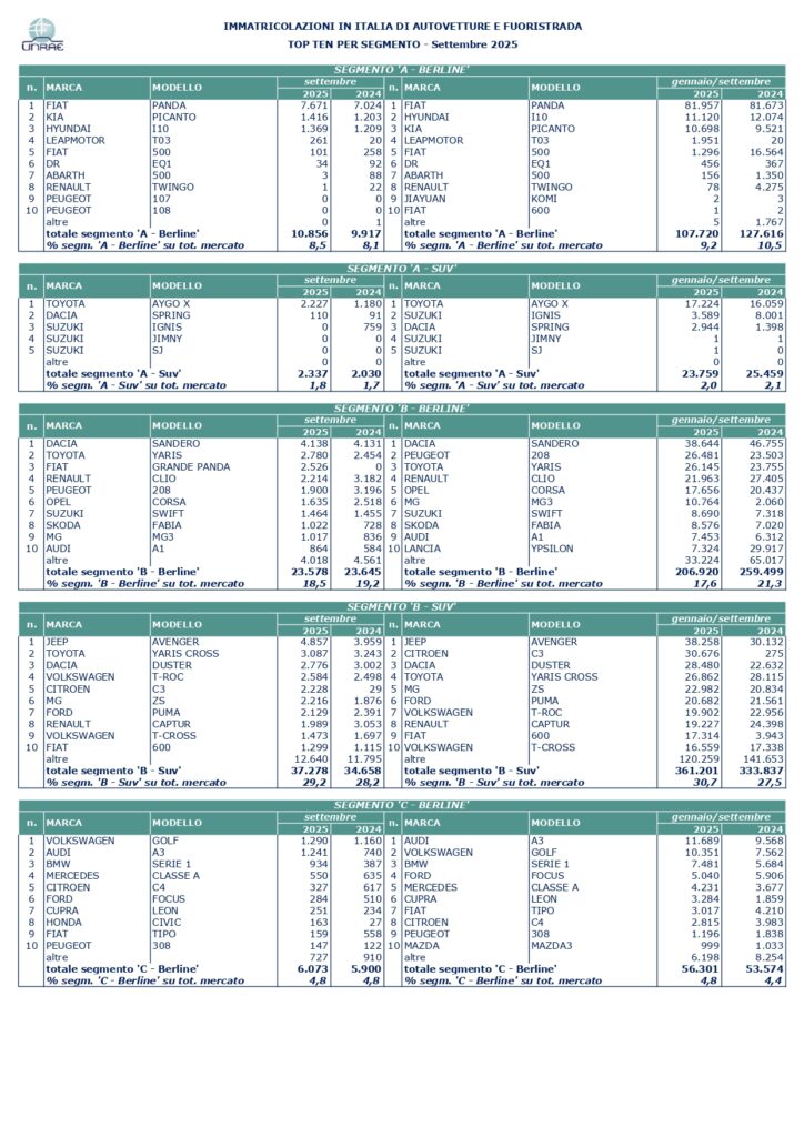“L’interruzione del trend negativo, già prevista da UNRAE, non costituisce un reale segnale di miglioramento, ma deriva solo dal confronto con un settembre 2024 già molto debole e dall’effetto del calendario, che nel 2025 ha un giorno lavorativo in più rispetto all’anno scorso. Il mercato si trova da tempo in una fase di stagnazione e il mese di settembre, confrontato col periodo pre-pandemico, mostra una perdita del 14,6% con 21.000 unità in meno”, ha dichiarato Roberto Pietrantonio, Presidente UNRAE.