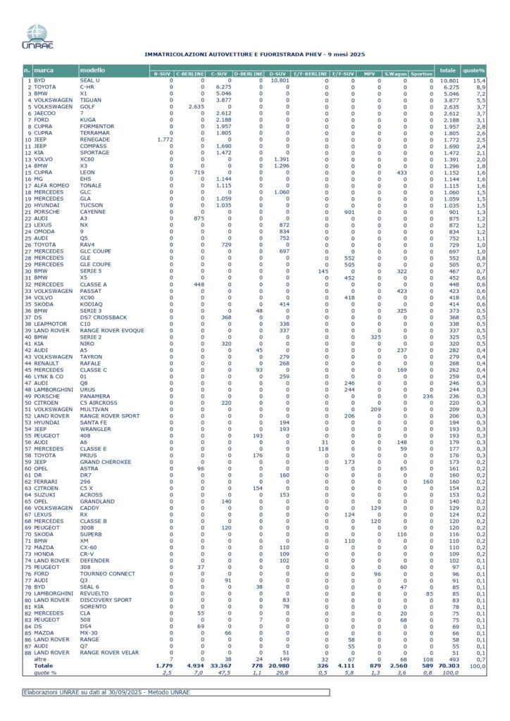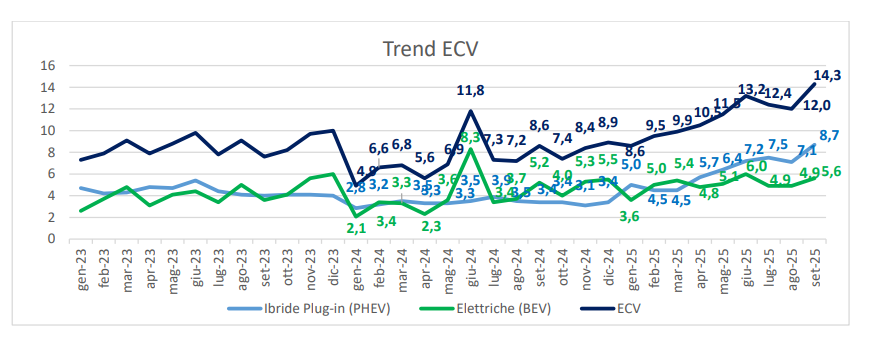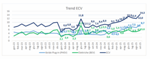 Il percorso verso la transizione energetica procede ancora con eccessiva lentezza. La quota di vetture elettriche pure (BEV) mostra un incremento rispetto al 4,9% di agosto e al 5,2% di settembre 2024, ma comunque si ferma a un modestissimo 5,6% del mercato. Per quanto riguarda le auto PHEV, settembre registra una quota dell’8,7%, in crescita rispetto al 7,1% di agosto e al 3,4% di settembre 2024, confermando un andamento positivo che trae vantaggio dalla nuova normativa sui fringe benefits. Complessivamente, a settembre la quota totale delle ECV si attesta al 14,3%.