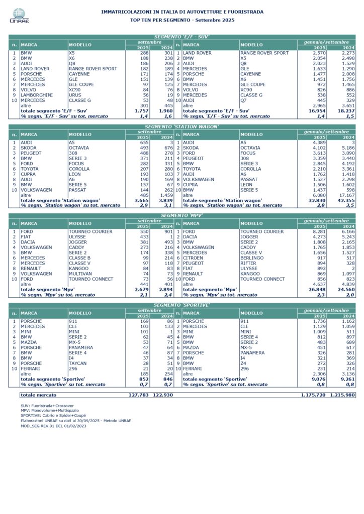 Infine, le station wagon rappresentano il 2,9% del totale, gli MPV il 2,1% e le sportive lo 0,7%. Sul fronte delle aree geografiche, in settembre il Nord Ovest conferma la leadership, con una quota in crescita al 31,2% (al 29,5% in gennaio-settembre, +1,2 p.p.). Il Nord Est perde 1,9 punti, al 26,2% del totale (30,0% nel cumulato), grazie al contributo del noleggio, senza il quale scenderebbe di 3,2 punti, al 23,0%. Il Centro Italia sale al 27,6% nel mese (+1,9 p.p., al 26,2% in gennaio-settembre), l’area meridionale scende al 9,9% e le Isole al 5,2% (rispettivamente 9,4% e 5,0% nel cumulato).