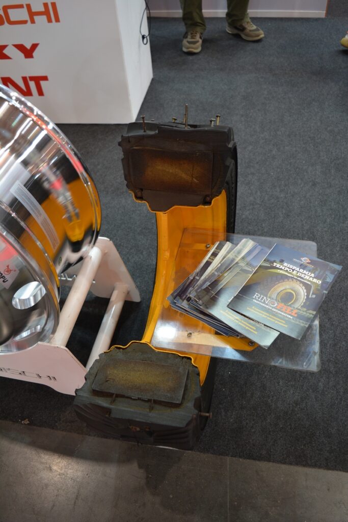 Un’altra specializzazione di Rinova Dischi è il riempimento: «Abbiamo un prodotto, che si chiama RinoFill, che trasforma una ruota pneumatica in una ruota piena. Iniettiamo un liquido che si solidifica, rendendo la ruota più robusta e resistente alle forature. È una soluzione pensata per usi gravosi, come il movimento terra o la raccolta rifiuti.»