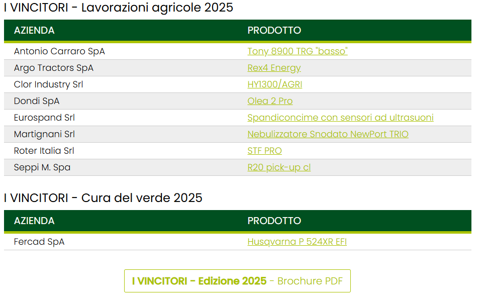 Nella prima sezione, la giuria di esperti appositamente nominata ha premiato la trattrice Tony 8900 TRG Bassa per frutteto e vigneto, specificamente indicata per le operazioni sottochioma e nei filari bassi; insieme si sono imposti la trattrice modello REX 4 Energy di Landini, particolarmente adatta agli impieghi negli uliveti intensivi, ma anche nei frutteti e vigneti che sono parte integrante dei paesaggi agricoli mediterranei. Premiati anche lo spandiconcime per vigneto ad ultrasuoni progettato dalla Eurospand, capace di erogare il fertilizzante solo in prossimità delle piante, con vantaggi in termini economici e ambientali; l’irroratrice trainata scavallante Newport Trio della Martignani, che si distingue per la grande compattezza; e il rover agricolo autonomo a trazione elettrica HY1300 Agri della Clor Industry.