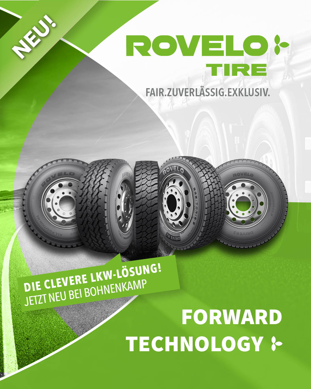 Con l’acquisizione della distribuzione in esclusiva in tutta Europa dei pneumatici per camion a marchio Rovelo, Bohnenkamp, uno dei principali grossisti europei di pneumatici, ruote e componenti per veicoli per uso professionale, introduce un nuovo marchio di pneumatici per camion nel suo già ricco portfolio. I pneumatici Rovelo vengono prodotti dal gruppo Sailun negli stabilimenti più moderni dell’Asia e la commercializzazione avviene in tutto il territorio di distribuzione del gruppo Bohnenkamp, esclusivamente tramite le rispettive società: la sede centrale di Osnabrück, in Bassa Sassonia e altre quattro sedi, sempre in Germania, che si occupano di vendita e magazzino, oltre a una fitta rete di distribuzione e assistenza e sedi in oltre 30 Paesi.