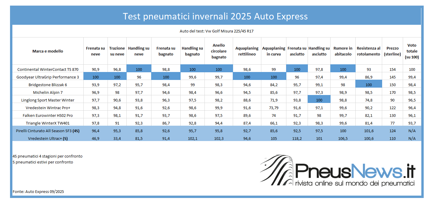 L’edizione 2025 della prova ha visto sfidarsi otto modelli montati su una VW Golf nella misura 225/45 R17, con prove su neve, bagnato e asciutto condotte tra Finlandia e Germania: quelle su neve si sono svolte al Goodyear Arctic Center in Finlandia, mentre quelle su bagnato e asciutto al Contidrom in Germania, con una ponderazione pensata per il clima britannico: 50% per le prestazioni sul bagnato, 20% per quelle su neve, 20% per l’asciutto e l’ultimo 10% per comfort, rumorosità e resistenza al rotolamento. Ecco la classifica finale.