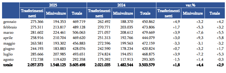 Nel mese di agosto il mercato dell’auto usata rimane sostanzialmente stabile: con 292.358 trasferimenti di proprietà (dati in attesa di consolidamento), il mese si posiziona in linea (-0,3%) rispetto ai 293.305 di agosto 2024 (-8,0% sul 2019). I trasferimenti netti cedono l’1,5%, mentre le minivolture segnano un +1,4%. Nei primi 8 mesi la crescita è del 2,9% con 3.605.498 trasferimenti (-0,4% sul 2019).