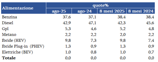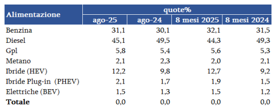 Nel mese il diesel mantiene la prima posizione fra le motorizzazioni, ma continua a ridurre il suo peso. Il diesel scende, infatti, al 42,9% di quota (-4,2 p.p. e al 42,3% nel cumulato), il motore a benzina guadagna mezzo punto al 37,6% nel mese (38,4% negli 8 mesi). Le ibride confermano una crescita sostenuta, toccando il 9,8% (in agosto e gennaio-agosto); seguono Gpl e metano rispettivamente al 5,3% e 2,2% nel mese (5,2% e 2,0% nel cumulato); BEV e plug-in salgono all’1,0% e 1,3% in agosto (1,0% e 1,3% negli 8 mesi).