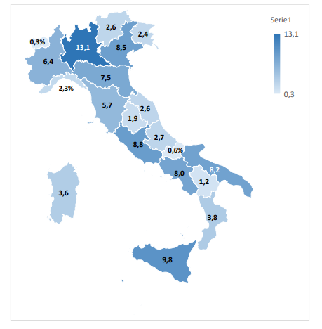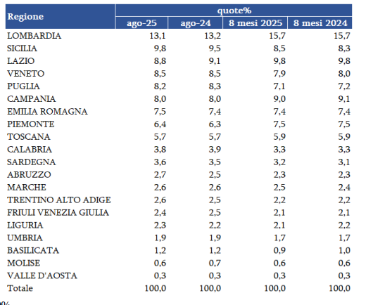 Nel mese di agosto l’analisi per regione mostra un ranking diverso dal solito. Al primo posto si conferma la Lombardia al 13,1% e al secondo sale la Sicilia al 9,8% (+0,3 p.p.), scavalcando il Lazio che scende in terza posizione con l’8,8% (-0,3 p.p.) per la flessione degli scambi sia fra privati che da operatore a privati/società. Al 4° posto il Veneto con l’8,5%, seguito dalla Puglia all’8,2% e dalla Campania all’8,0%.