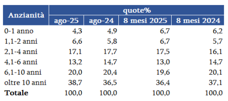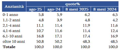Anche fra le minivolture recupera la quota delle autovetture con più di 10 anni, al 38,7% del totale: 2,2 punti in più di agosto 2024. Perde 0,4 punti la fascia da 6 a 10 anni (al 20,0%) e 1,5 punti quella da 4 a 6 anni, al 13,2%. Cede anche la fascia da 2 a 4 anni (al 17,1%); in aumento la fascia da 1 a 2 anni, al 6,6% (+0,8 p.p.), mentre cede quella fino a 1 anno, al 4,3% (-0,6 p.p.). Nel complesso, le minivolture di vetture fino a 4 anni di anzianità coprono il 28,0% ad agosto, -0,4 p.p. sullo stesso mese 2024