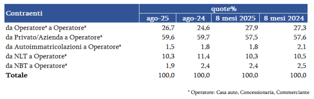 In agosto i trasferimenti per contraente confermano l’andamento dei mesi precedenti: gli scambi tra privati/aziende, che rimangono largamente predominanti, guadagnano 0,8 punti e rappresentano il 57,2% di tutti i passaggi di proprietà (56,4% negli 8 mesi). Parallelamente, 1,3 punti vengono persi da quelli da operatore a cliente finale, al 38,0% nel mese e 39,1% nel cumulato. Guadagnano mezzo punto gli scambi provenienti da auto-immatricolazioni (4,1% in agosto e 3,6% nel cumulato), mentre rimangono stabili, ma marginali, quelli provenienti dal noleggio (0,7% complessivo nel mese e 0,9% negli 8 mesi).