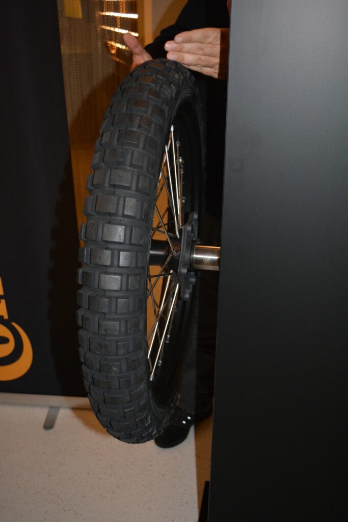In particolare, i tasselli dello pneumatico anteriore, inclinati in avanti in direzione di marcia, migliorano la frenata in off-road, mentre quelli del posteriore, orientati in direzione opposta, assicurano massima trazione in accelerazione.