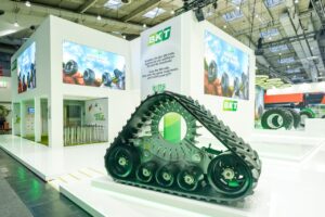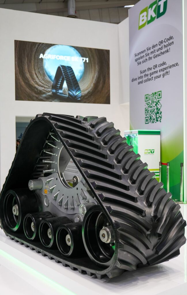 Un’ampia gamma di innovazioni che non trova espressione soltanto negli pneumatici, ma si estende oltre, verso i cingoli in gomma, che nel settore della meccanizzazione agricola stanno acquisendo un ruolo sempre più strategico. La risposta di BKT a queste esigenze è AGRIFORCE BK T71, esposto nella misura 36x6x44, progettato per le mietitrebbie di nuova generazione, dunque con dimensioni notevoli e carichi importanti.