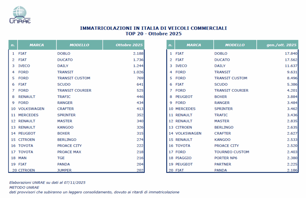 Il mercato dei veicoli commerciali leggeri registra a ottobre un andamento positivo, confermando il trend di agosto e settembre. Le immatricolazioni si attestano a 17.320 unità, con un incremento del 4,3% rispetto alle 16.601 unità dello stesso mese del 2024, che però aveva registrato una contrazione del 14,8%. Nel periodo gennaio-ottobre il bilancio rimane negativo con una diminuzione del 5,0%, per un totale di 158.958 unità contro le 167.268 immatricolate nello stesso periodo dell’anno precedente.