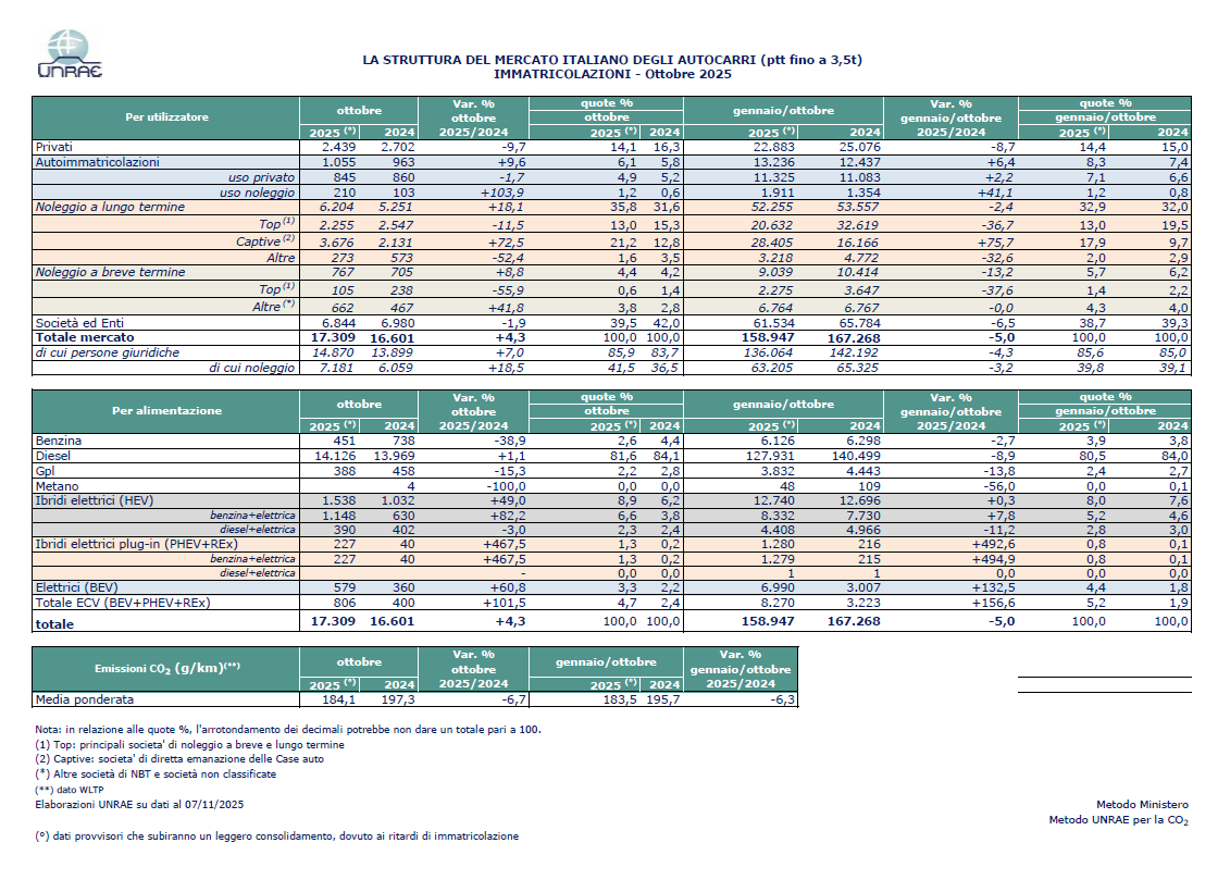 Sul fronte delle motorizzazioni, a ottobre il diesel si mantiene in leggera crescita ma cede 2,5 punti di quota, scendendo all’81,6% del totale (80,5% nel cumulato, -3,5 p.p.). Il motore a benzina nel mese cede 1,8 punti, al 2,6% (al 3,9% nei 10 mesi, +0,1 p.p.). Il Gpl scende al 2,2% (-0,6 p.p. e al 2,4% in gennaio-ottobre), i veicoli plug-in guadagnano 1,1 punti, salendo all’1,3% (0,8% nei 10 mesi). I veicoli BEV a ottobre salgono al 3,3% (+1,1 p.p.) e nel cumulato passano dall’1,8% di un anno fa al 4,4% attuale, mentre i veicoli ibridi guadagnano 2,7 punti e coprono l’8,9% del totale nel mese (8,0% in gennaio-ottobre). La CO2 media ponderata nel mese scende del 6,7% (e 13,2 g/Km) a 184,1 g/Km, rispetto ai 197,3 g/Km dello stesso periodo 2024 (183,5 g/Km nei 10 mesi, -6,3%).