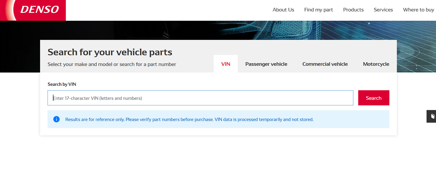 Con questo nuovo tool, gli utenti devono semplicemente inserire il codice VIN a 17 caratteri alfanumerici del veicolo: il sistema identifica immediatamente il corrispondente ricambio Denso, senza la necessità di inserire manualmente marca, modello, tipologia di motorizzazione.