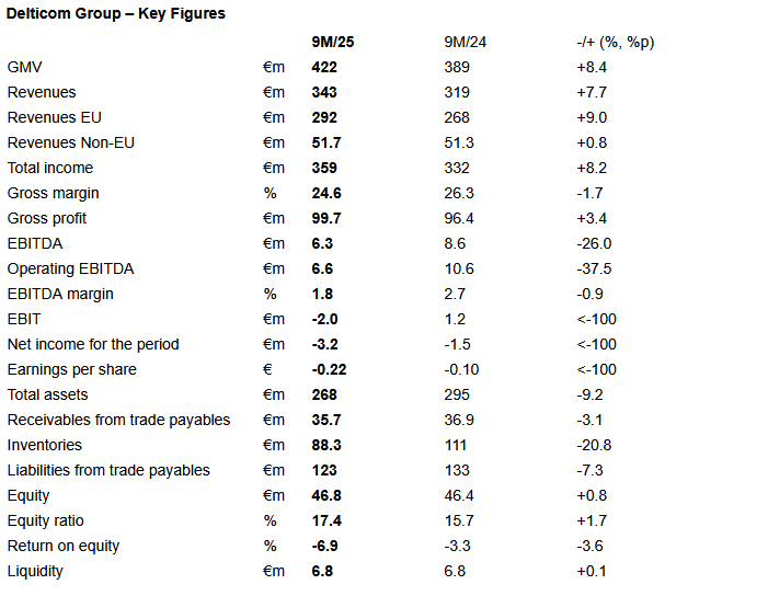 Nei primi nove mesi del 2025, il gruppo Delticom ha generato un fatturato di 343 milioni di euro, rispetto ai 319 milioni di euro dell’anno precedente. Si tratta di un aumento dell’8%. Con 107 milioni di euro, il fatturato del terzo trimestre si è mantenuto al livello dell’anno precedente (terzo trimestre 2024: 107 milioni di euro). Il volume lordo delle merci è stato di 422 milioni di euro nei primi nove mesi del 2025 (primi nove mesi del 2024: 389 milioni di euro).