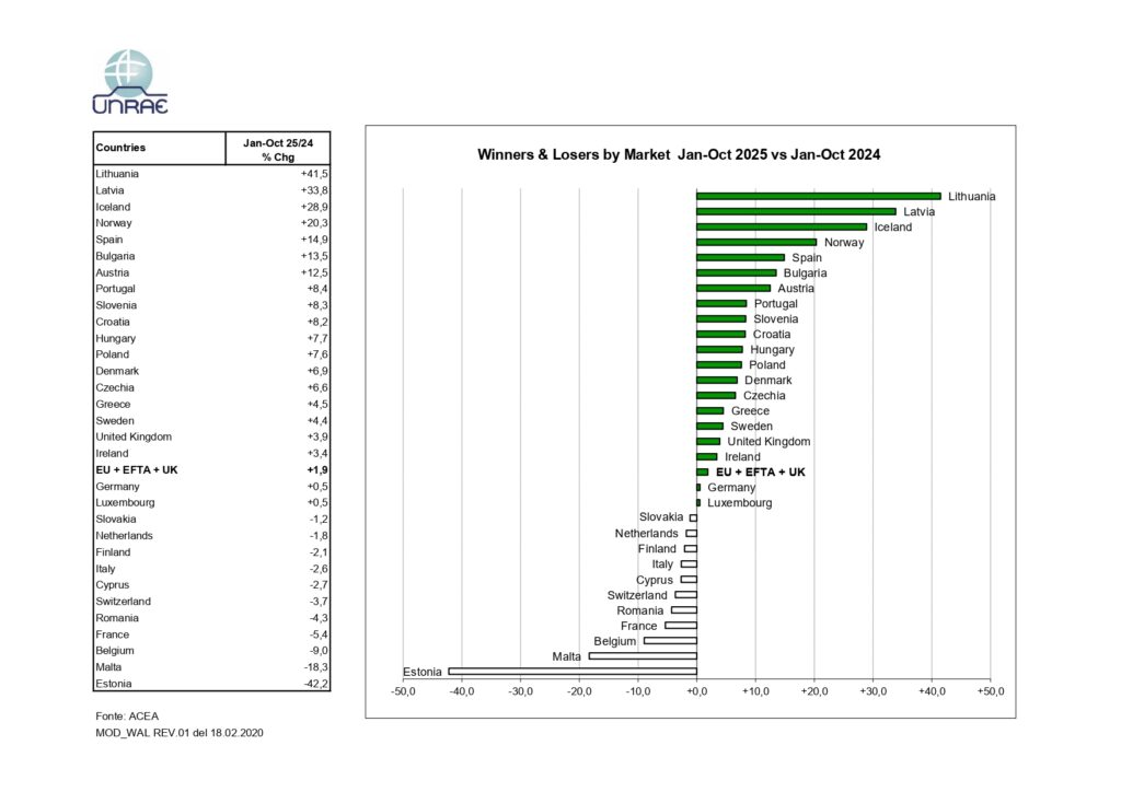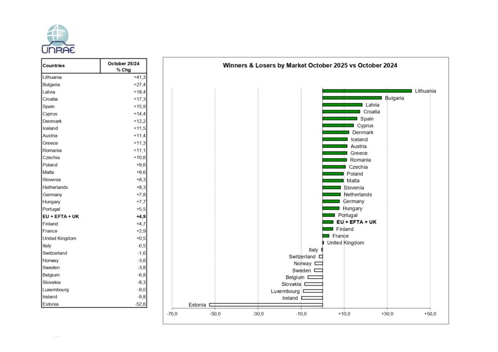 Mercato Europa, ottobre 2025 a +4,9%. Nei primi 10 mesi +1,9%, ma ancora -17,3% rispetto al 2019