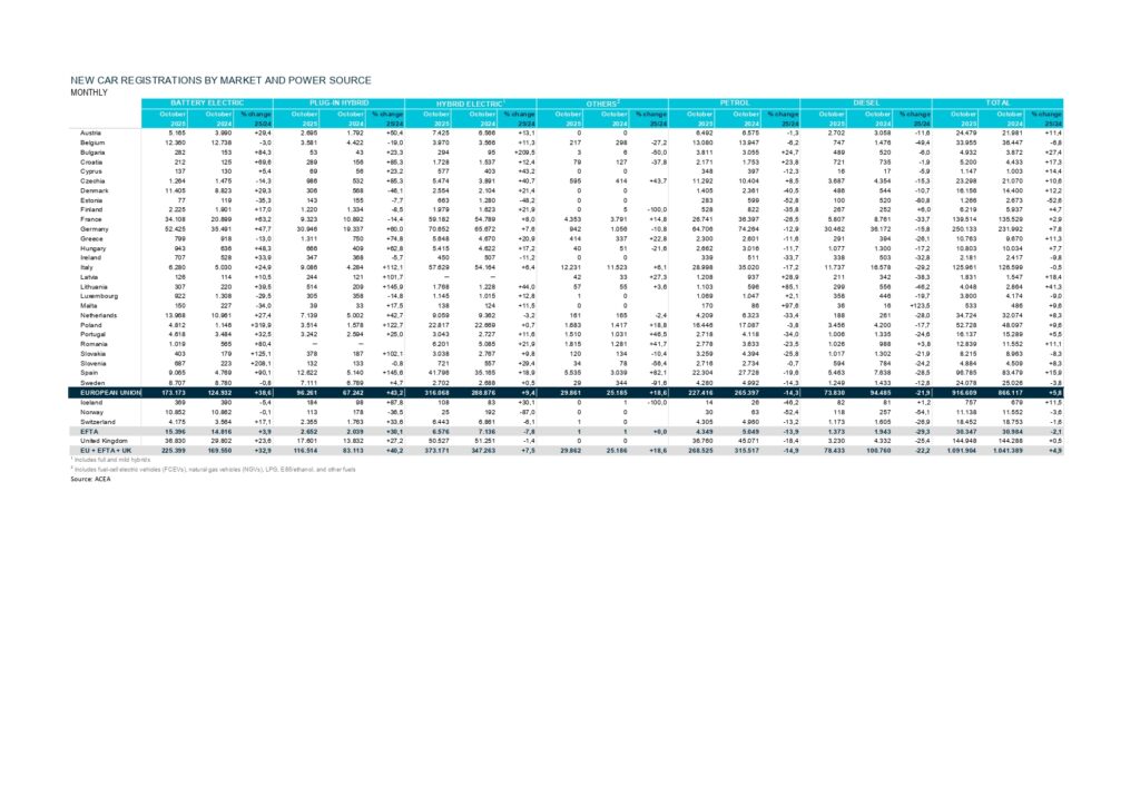 Il mercato europeo delle autovetture prosegue il suo trend positivo registrando a ottobre una crescita del 4,9% con 1.091.904 immatricolazioni rispetto alle 1.041.389 unità dello stesso mese del 2024. Nel periodo gennaio-ottobre il mercato europeo totalizza 11.020.514 immatricolazioni: un incremento dell’1,9% rispetto alle 10.818.539 dei primi dieci mesi del 2024.