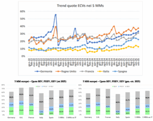 Anche nel periodo gennaio-ottobre la situazione italiana si conferma critica con una quota di ECV all’11,2%, di cui il 5,2% di BEV e il 6,0% di PHEV, rispetto al 33,4% del Regno Unito (BEV 22,4% e PHEV 11,0%), al 28,9% della Germania (BEV 18,4% e PHEV 10,5%), al 25,1% della Francia (BEV 18,9% e PHEV 6,2%) e al 18,9% della Spagna (BEV 8,5% e PHEV 10,4%) Nel totale del mercato europeo le ECV coprono il 27,7% di share con le BEV al 18,3% (+3,5 p.p.) e le PHEV al 9,4% (+2,2 p.p.).