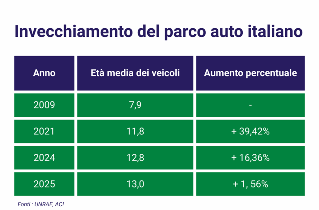Secondo l’Annuario Statistico dell’Automobile Club d’Italia, a inizio 2025 l’età media delle autovetture italiane ha raggiunto 13 anni, proseguendo una tendenza ormai consolidata. Rispetto al 2009 — quando la media era di 7,9 anni secondo UNRAE — l’invecchiamento del parco è oggi superiore a 5 anni.