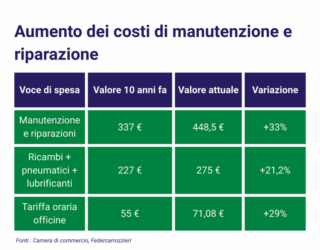 Negli ultimi dieci anni la spesa media annua per manutenzione ordinaria e riparazioni è aumentata del 33% (fonte: Federcarrozzieri). Nello stesso periodo, la spesa per pezzi di ricambio, pneumatici e lubrificanti è cresciuta del 21,2%. La tendenza non si è arrestata: tra il 2023 e il 2024 la manutenzione è aumentata ulteriormente del 3,3%, mentre i ricambi hanno registrato un +2,5%.