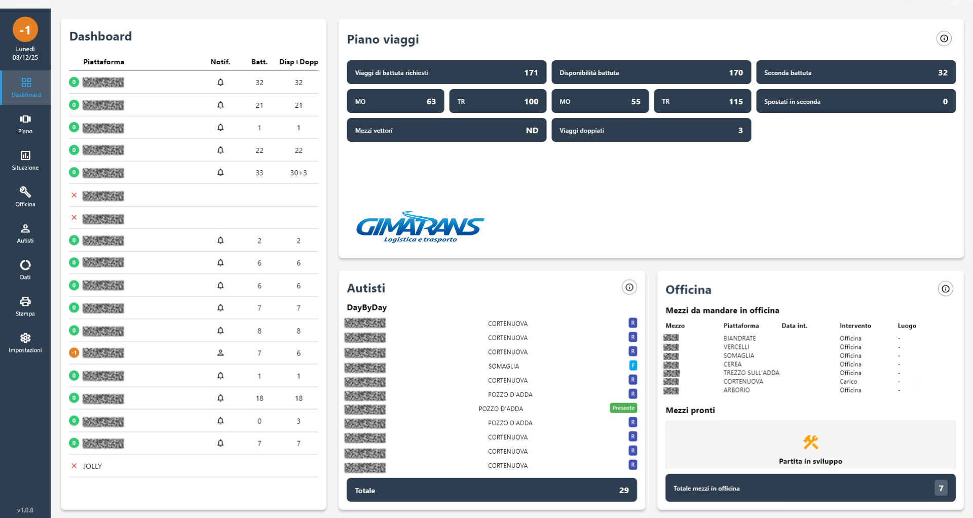 “Dal punto di vista operativo, grazie ai contatori presenti sulla Dashboard, ogni pianificatore ha completa visibilità sull’organizzazione giornaliera della flotta e quindi una maggiore autonomia di gestione. Il disponente, vedendo il numero del contatore che indica la disponibilità dei mezzi in tempo reale e su quali piattaforme, sa nell’immediato quanti mezzi deve rendere disponibili per i viaggi del giorno successivo e questo è un grande vantaggio” – afferma Gabriele Togu, Coordinatore Ufficio Traffico di GI.MA.TRANS.