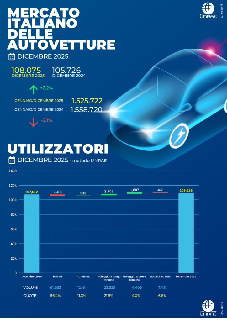 Mercato auto 2025: dicembre a +2,2%, ma l’intero anno chiude a -2,1%