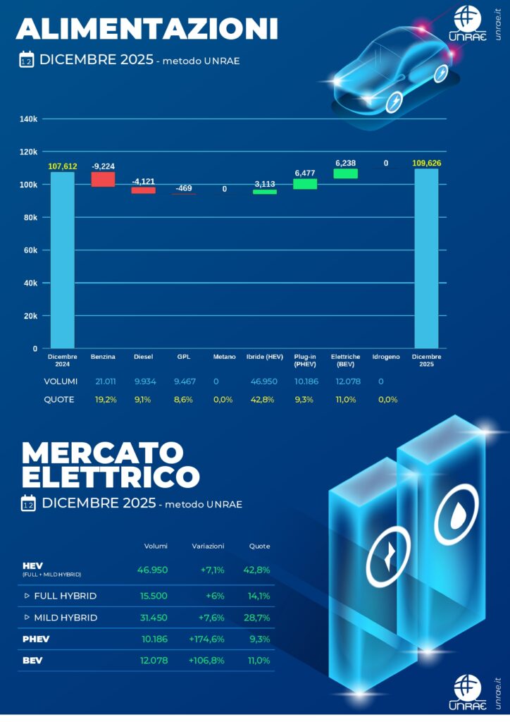 La quota complessiva delle vetture ricaricabili raggiunge quindi il 20,3% a dicembre, ma nei 12 mesi si ferma al 12,7%, suddiviso in parti quasi uguali fra BEV (6,2%) e PHEV (6,5%). Il 2025, un anno cruciale, si conferma così un altro anno perso per la transizione energetica.